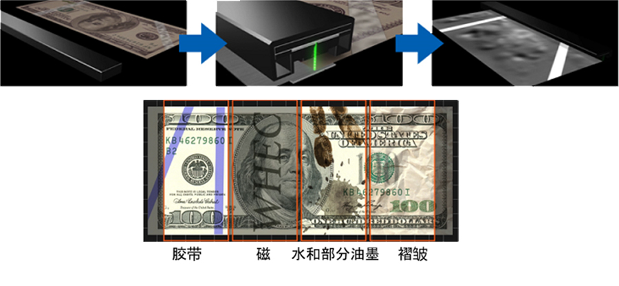 容量圖像傳感器(DIS)可檢測(cè)紙幣上的膠帶、水和部分油墨、褶皺及微小厚度變化(30微米)