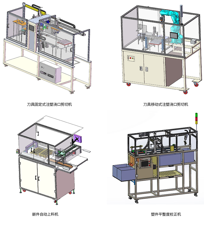 可設(shè)計(jì)多種注塑智能輔助功能,如:自動(dòng)剪澆口、自動(dòng)去除毛刺、嵌件自動(dòng)上料、塑件平整度校正等。